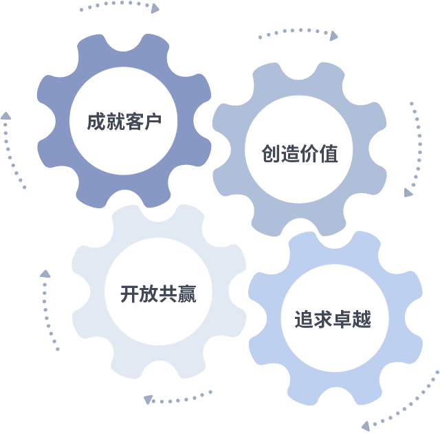 成就客户是一切决策的出发点,,创造价值是衡量所有工作的标准,,追求卓越是我们做事做人的态度,,,开放共赢是我们的格局也是最终的结果。。。。价值观的齿轮环环相扣,,推动着组织里的每个人不断向前。。