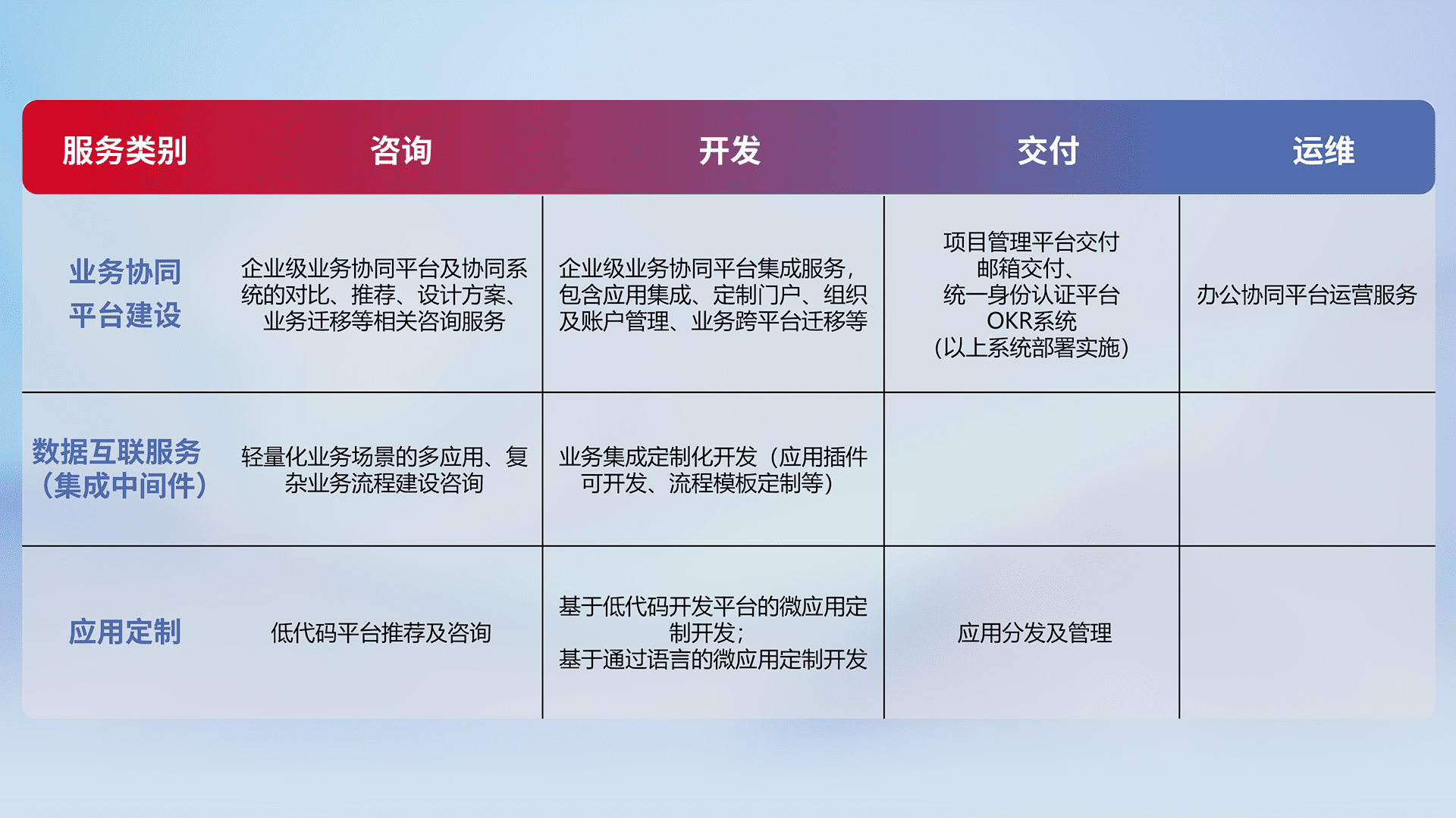 针对钉钉、、、企微、、、、IDaas等平台级产品提供产品的规划、、、、方案、、、、交付、、、、定制化开发等服务,,,,实现如统一协同办公、、、智能客户服务、、混合会议管理、、智能数据查询、、等业务场景,,,实现数字化转型。。。